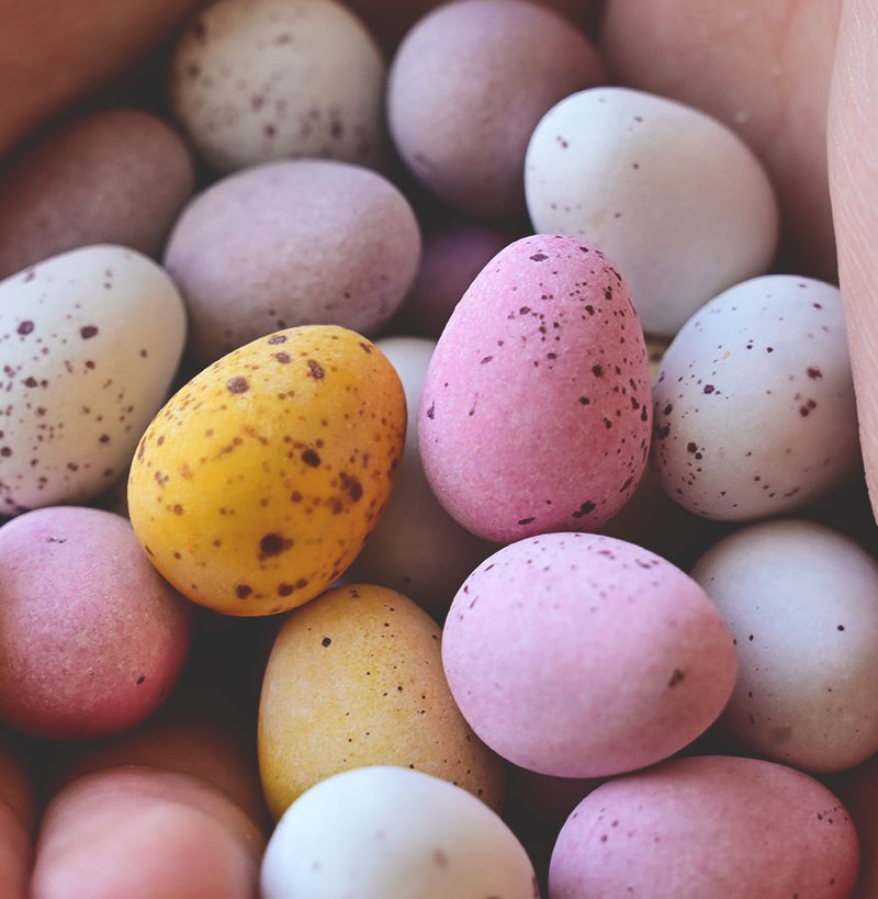 Des œufs au chocolat au lait recouverts d'une coque en sucre colorée.