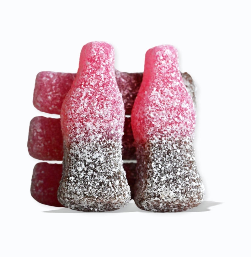 Sucre, sirop de glucose, eau, gélatine, acidifiant : E270, E296, E330, E350, sirop de caramel, arôme, concentré de jus de carotte noire.
